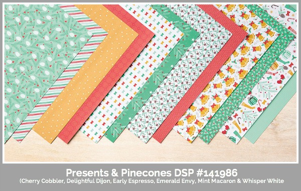 The DSP that I used today is a new kid on the block, Presents & Pinecones! It is fun and fresh and I have the colors listed below that coordinates with it. It is Cherry Cobbler, in the picture it looks rather like “coral” to me….This print is on the flip side of the little stars!