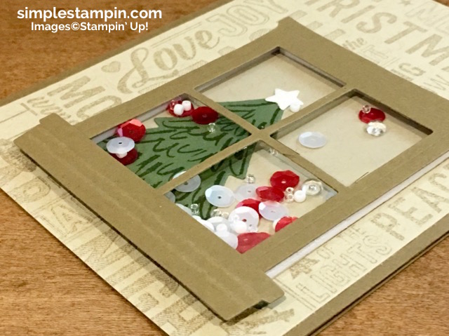 You can see by the pictures that I stamped the tree and cut it out like a normally would do but then I also cut a piece of Crumb Cake to go behind the window. Below you will see that I simply adhered the tree and then snipped off the edges for the backdrop of the shaker element!