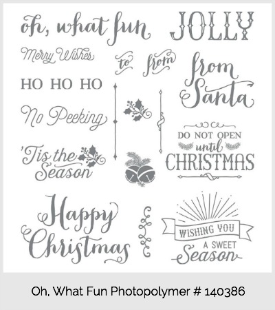 The sentiment is from the Oh, What Fun Photopolymer Set that is in the annual catalog, it is filed with great clean, fun and classic sentiments that will be a help to many Holiday projects!