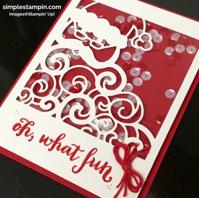 Now I ask you……“Oh, What FUN” it is to have a shaker card and this framelit is SUPER easy to make one from. WHY???? Easy. The border edge all around the Santa makes it a cinch to add the foam adhesive strips to adhere together!