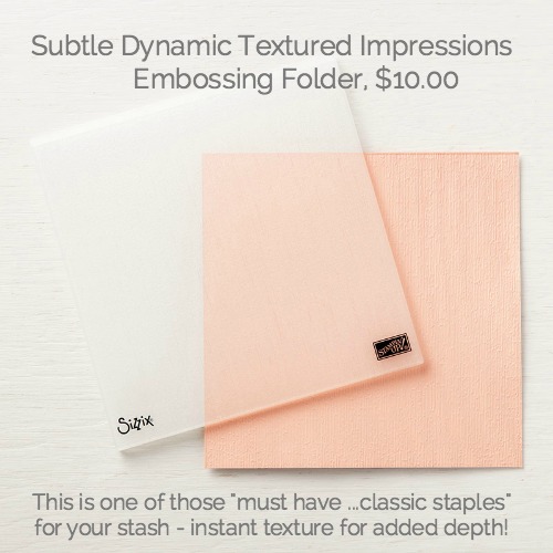 One thing that I have shared many time is…I forget to use Embossing Folders on a regular basis and that is SIMPLY SILLY as these gems have a BIG CREATE WOW FACTOR with minimal effort and the price point it BINGO…..heck – you could get this bundle and this embossing folder (that would = $54.00 and you would see be at that “sweet spot” to get the $5.00 off for next month)