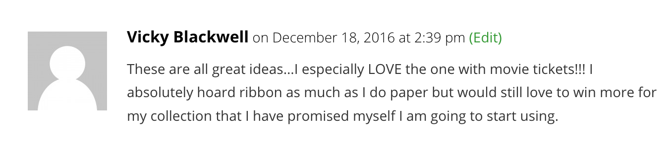 Here is her comment – I cracked up with the hoarding comments from yesterday but let’s face it….we are out there! Thanks for leaving the comment and please email me with your address and I will add to your ribbon stash! I am just lovin’ being Santa!