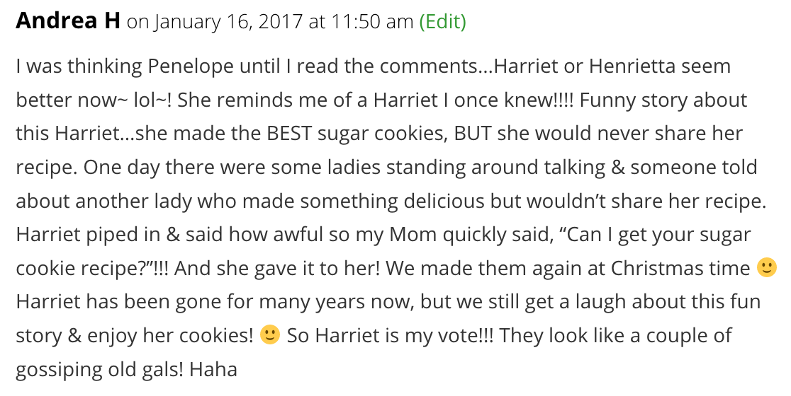 Please click here to see that post and then grab another cup of coffee and read the comments…you will be glad that you did it because not only is it a hoot…but it just shows this great fun we have together! I received probably 15 emails as well 33 comments with ideas of names.I have narrowed it down to a couple…so let’s see who wins!