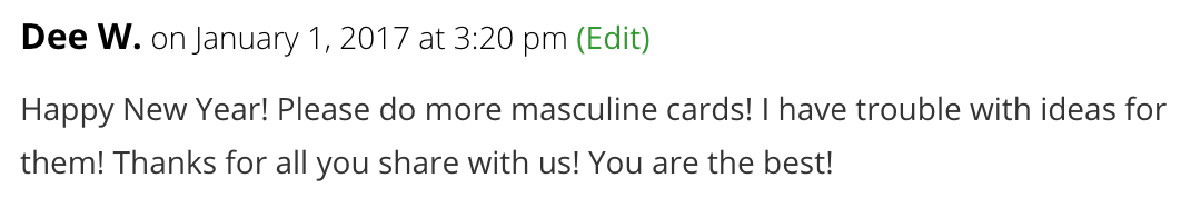 Way to go and many thanks for popping onto my blog and giving feedback! Happy New Year to you and please email me with your address. It seemed like Sympathy and Masculine are hot topics and I can honestly say that these are the (2) requests that my dear husband asks for. He likes to keep a stash of my cards to send to clients but does not like them to be too frilly!